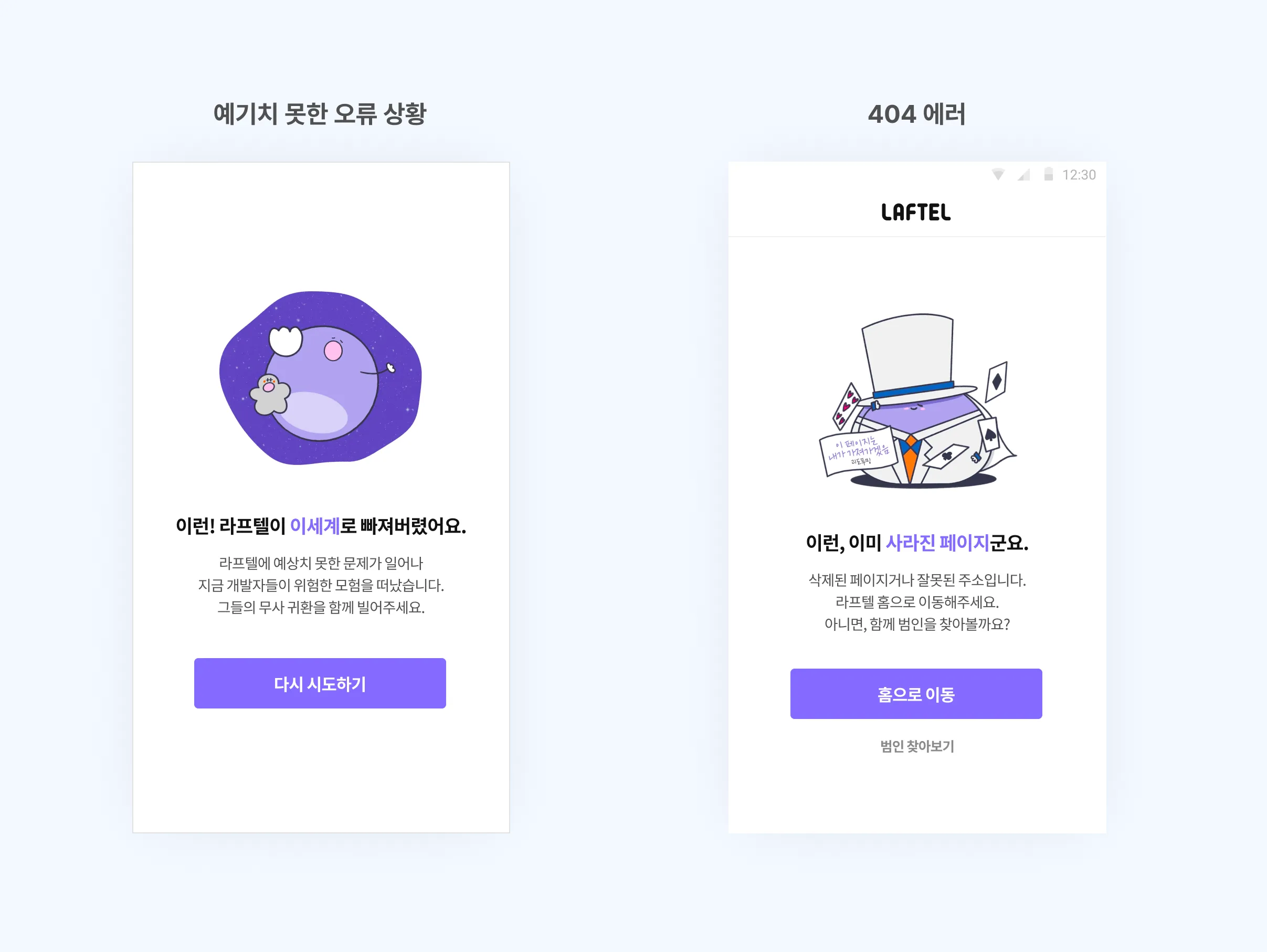 다만, 가이드라인이 절대적인 것이라고 생각하진 않습니다. 예를 들어, 최종적으로 정해진 라프텔의 보이스톤은 전반적으로 친근한 친구의 이미지이지만, 결제와 같이 비용이 오가는 상황에서는 해당 보이스톤을 고집하지 않고 좀 더 신뢰감을 줄 수 있는 톤을 사용합니다. 이처럼 무조건 가이드라인을 따르기보다는 상황에 따라 유연하게 대응하고자 합니다.