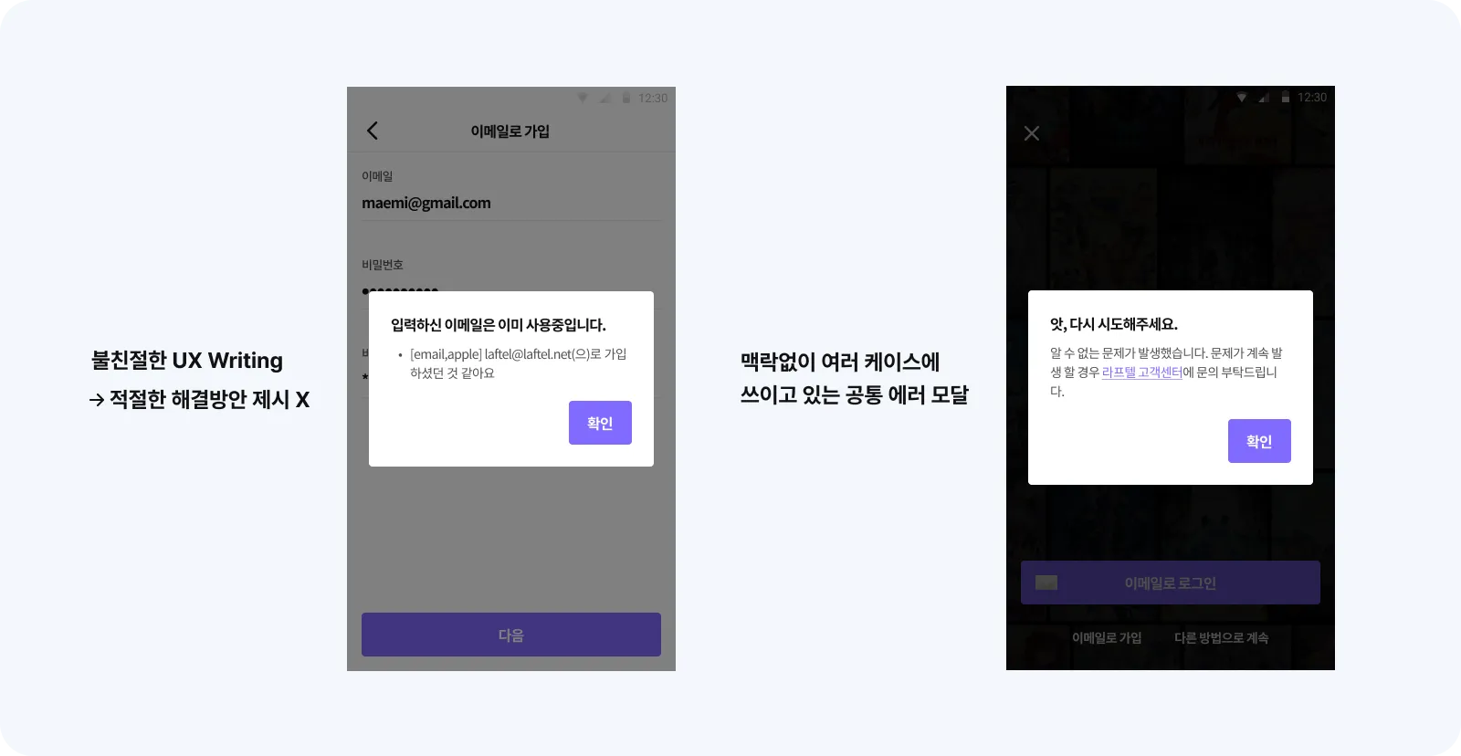 또한 오른쪽 모달은 로그인/가입에서 쓰이고 있는 공통 에러 모달인데 소셜 계정으로 로그인을 중도에 취소할때에도 해당 모달이 뜨고 있었어요. 유저입장에선 뜬금없는 UX Writing이라 좋은 유저 경험은 아니겠다고 생각했습니다.🤔