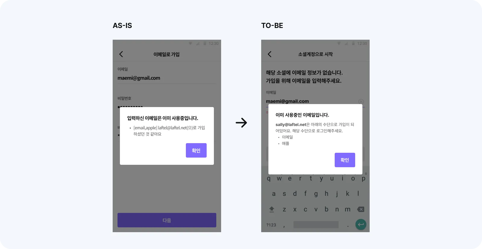 아래 왼쪽 모달은 가입 시도시 입력한 이메일이 중복 이메일인 경우에 뜨는 화면인데요. 괄호 안의 내용을 명확하게 파악하기 힘들뿐더러 유저에게 적절한 해결 방안을 제시하고 있지 않았어요.