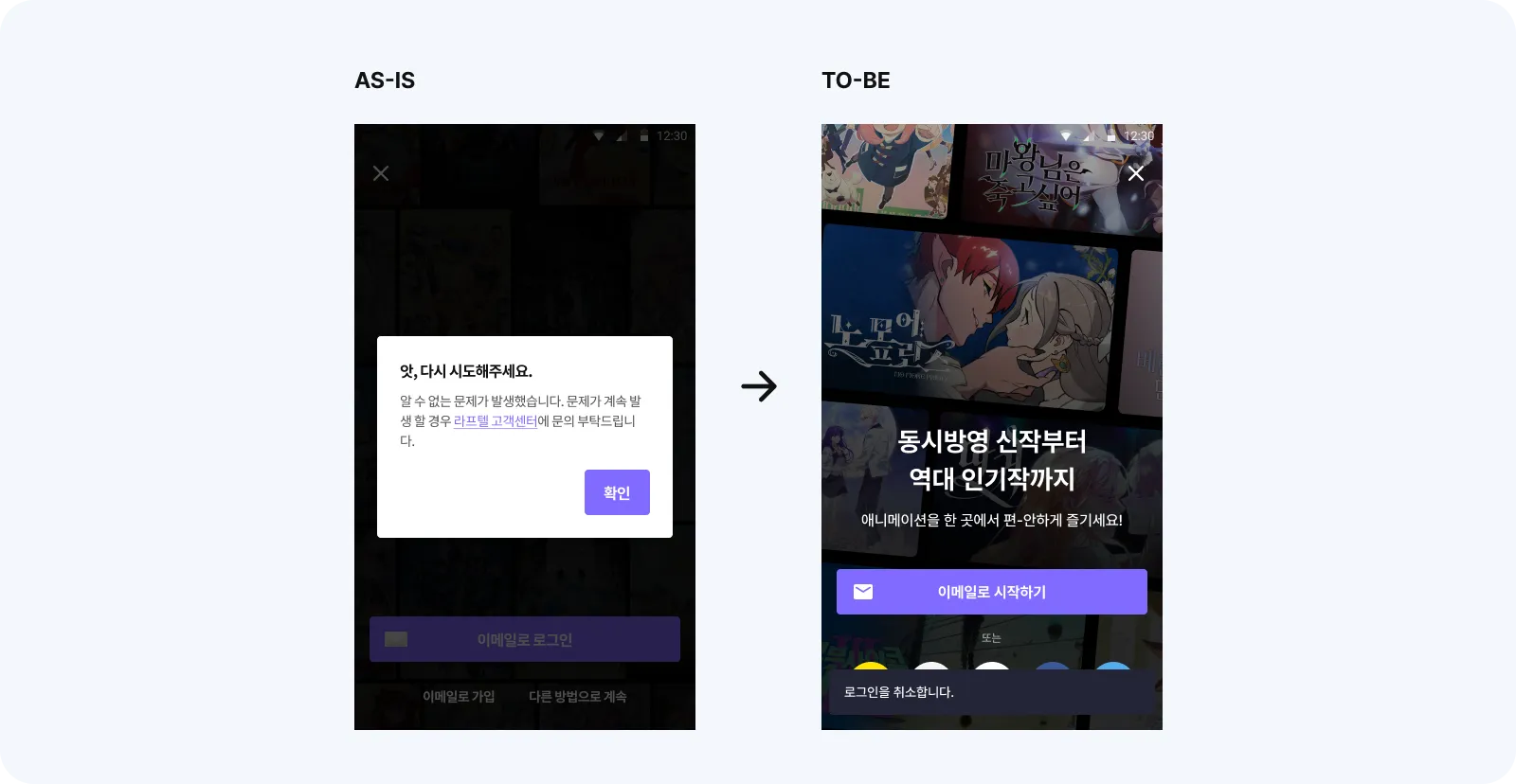 두 번째로는 소셜 계정 로그인 취소시에 뜨던 공통 에러 모달을 케이스에 맞게 로그인 취소 토스트로 변경을 하는 작업을 진행했습니다.