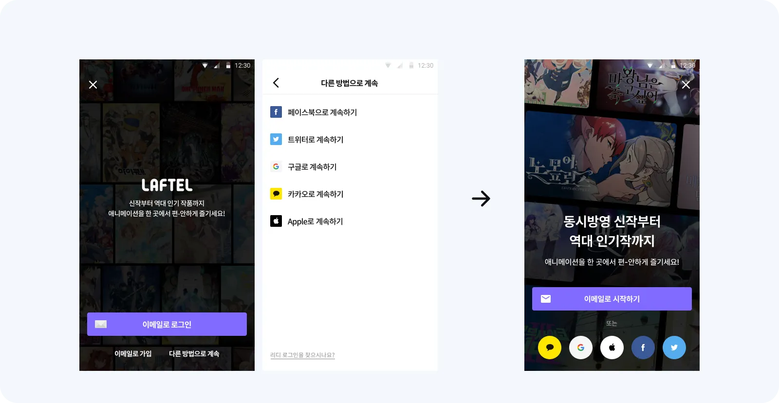 불필요한 뎁스를 줄이기 위해 로그인이 필요한 화면엔 바로 로그인/랜딩 화면으로 이동할 수 있도록했고 소셜 계정 수단들을 화면 하단에 원형 아이콘 UI로 배치하여 뎁스를 줄이는 작업을 진행했습니다. 또한 가장 많이 사용되는 소셜 계정들을 순서대로 배치해 중요한 버튼에 대한 우선순위를 높였습니다.