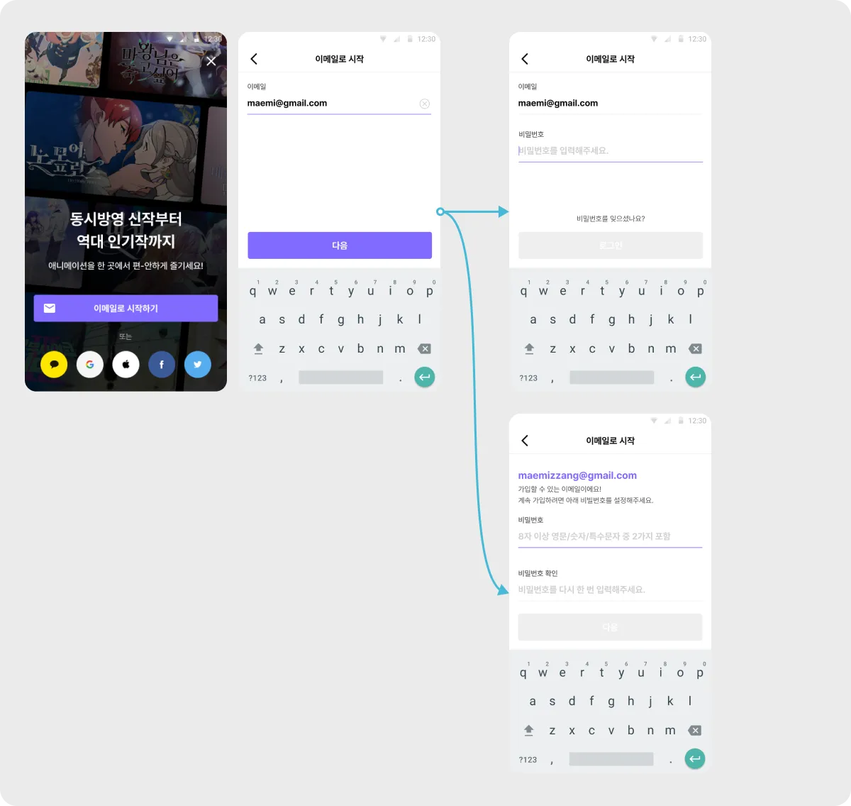 두 번째는 랜딩 화면의 단순하고 직관적인 인터페이스를 위해 이메일 로그인과 이메일 가입을 이메일로 시작하기라는 버튼 하나로 통합했어요. 이메일 입력 후에 계정 유무 판별을 거쳐 로그인 플로우 혹은 가입 플로우로 타게끔 개선한거죠.