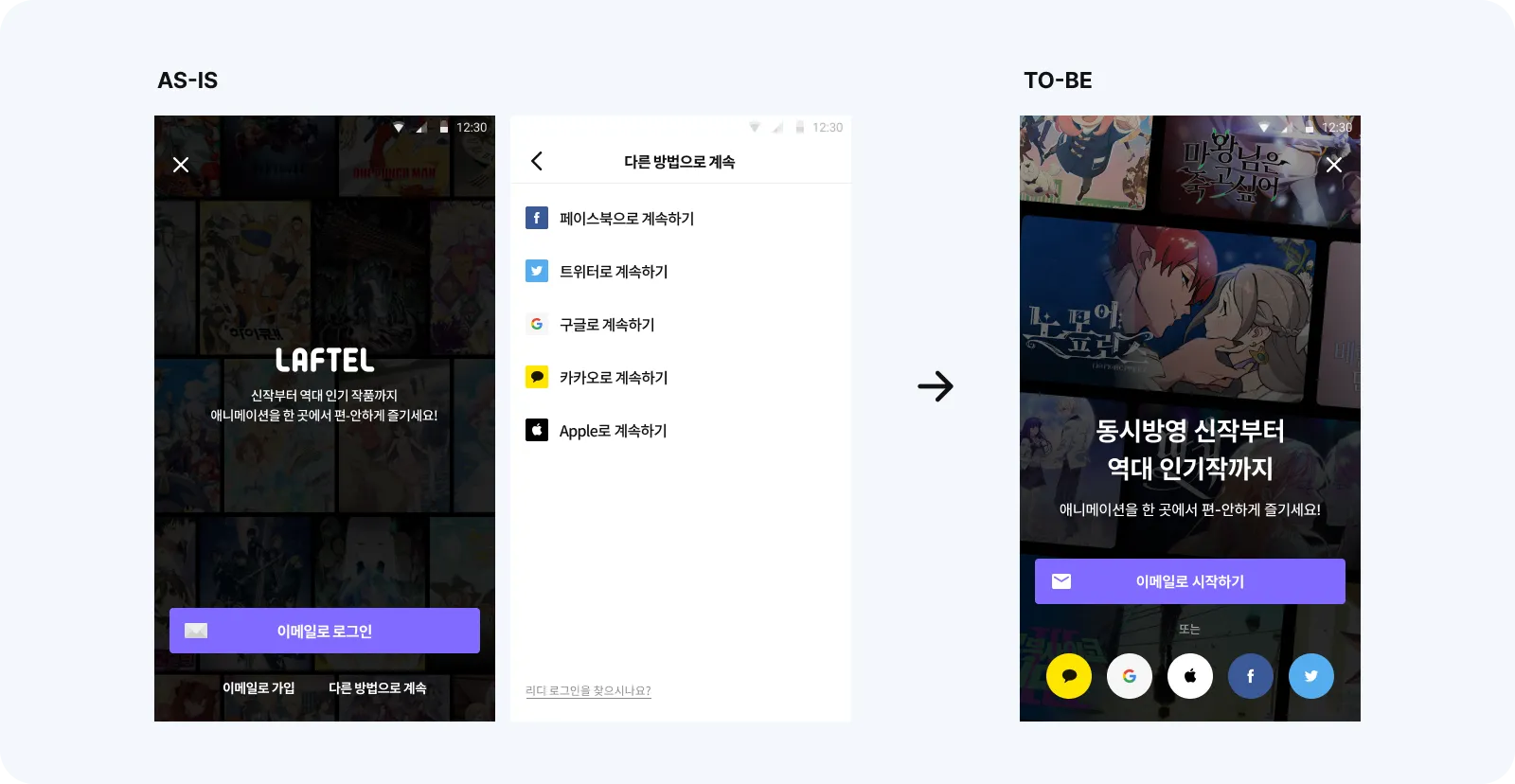 개선 전과 개선 후 유저 플로우를 비교해 보면 한 눈에 봐도 정말 간단해진걸 확인할 수 있어요. 다양한 케이스들이 복잡하게 얽혀있던 유저 플로우가 오로지 로그인/가입에 유저 골에만 집중할 수 있도록 간단하게 정리가 되었어요.