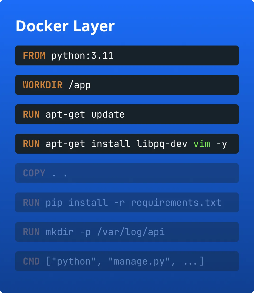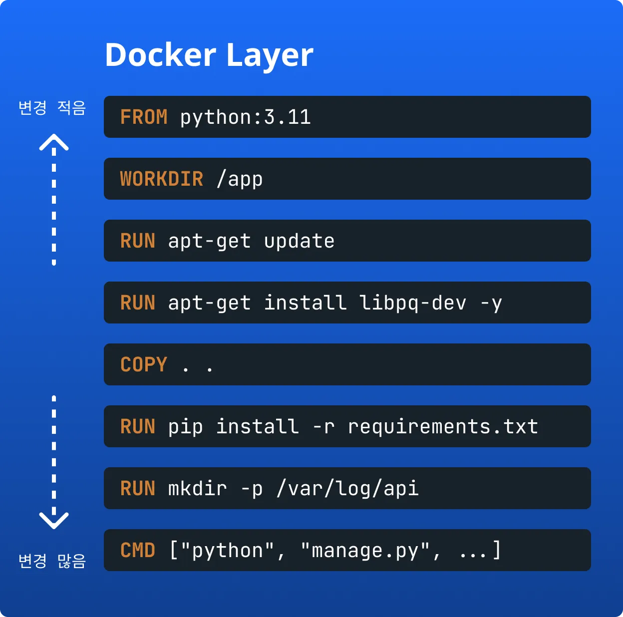 우선 Docker의 명령(Instruction)(FROM/WORKDIR/RUN/COPY/…)은 불변 레이어를 만들어요. 여기서, 어떤 레이어의 입력이 한 글자라도 바뀌면, 해당 레이어와 이후 레이어의 캐시가 전부 무효가 됩니다.
