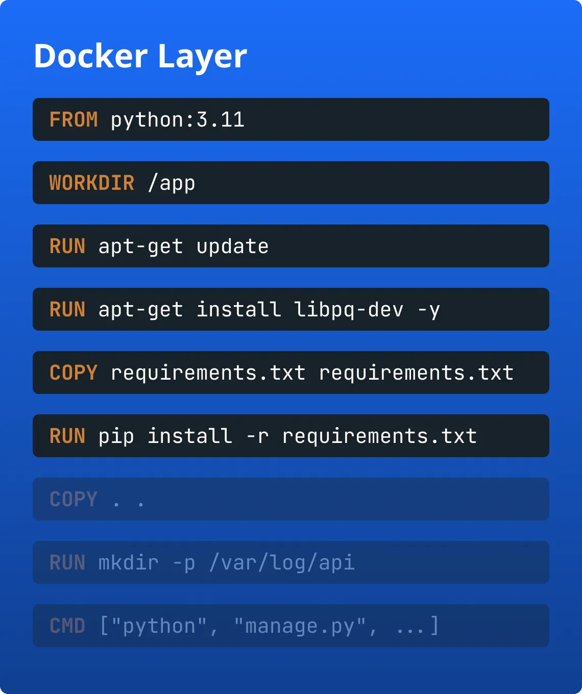 여기서 중요한 것은 파이썬은 패키지 설치 과정에서 특히 많은 시간을 차지하는데요, 위 예시에서는 COPY . . 뒤에 오기 때문에 패키지 설치 또한 캐시 미스가 발생한다는 점입니다.
