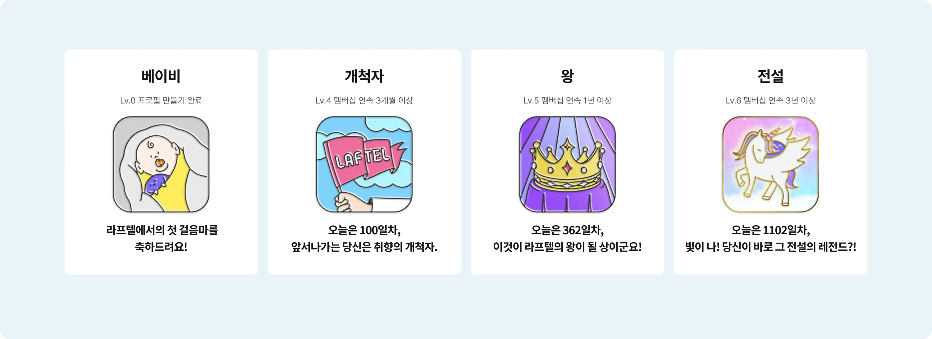 라프텔엔 작은 게이미피케이션 요소인 등급 제도가 있습니다. 등급 명은 유명한 판타지 세계관을 따라 비교적 심플하게 지어보았어요. 언젠가 미래에 등급 체계를 업그레이드시킬 수 있지 않을까 희망을 갖고 있습니다. (학원물의 영웅, 두뇌싸움의 개척자, BL의 전설…)