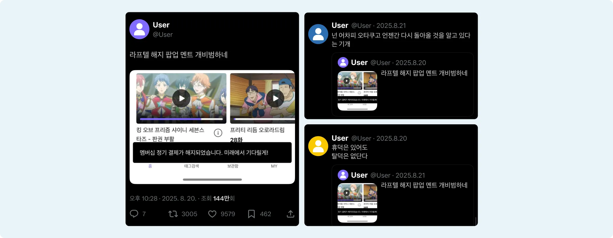 라프텔은 애니메이션을 사랑하는 사람들이 모인 곳이죠. ‘라프텔다움’은 이러한 사용자와 사용자 간의 유대감뿐 아니라, 애니메이션에 진심인 라프텔과 사용자 간의 유대감도 돈독히 만들어줄 수 있다고 생각해요. 장기적으로 서비스의 브랜드 이미지에 도움이 되어, 같은 가치를 주는 경쟁사 대비 ‘더 쓰고 싶게’ 만들어 줄 수도 있겠죠.