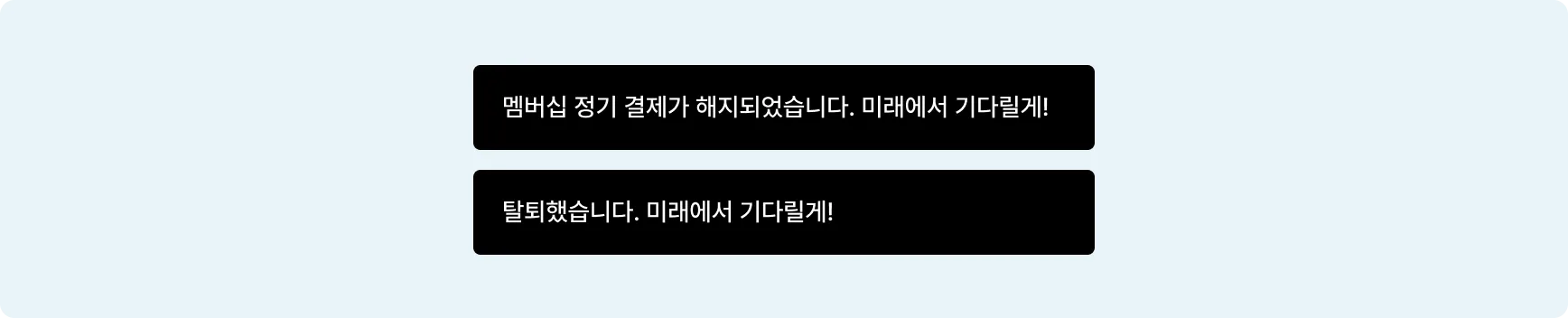 예시 미래에서 기다릴게! 멤버십 결제가 해지되었어요. (X) → 멤버십 정기 결제가 해지되었습니다. 미래에서 기다릴게!(O)