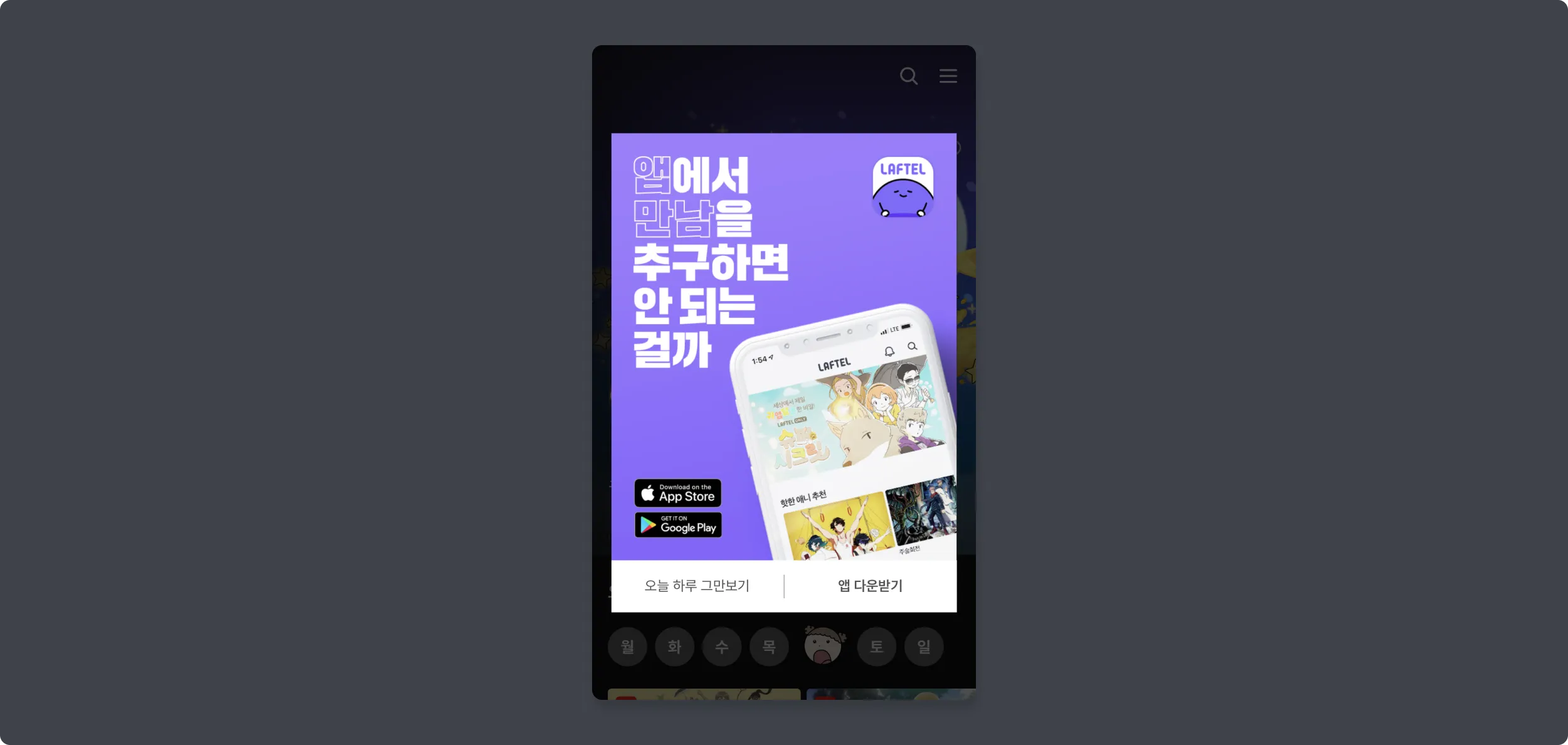 모바일에서 앱이 아닌 웹 브라우저로 라프텔에 접속했을 때 뜨는 팝업입니다. 앱 설치를 유도하기 위한 화면으로, 역시 유명한 애니메이션 작품 <던전에서 만남을 추구하면 안 되는 걸까>의 제목이 인용되었습니다. 이건 라프텔의 멋을 담당하는 디자인팀의 아이디어였어요.