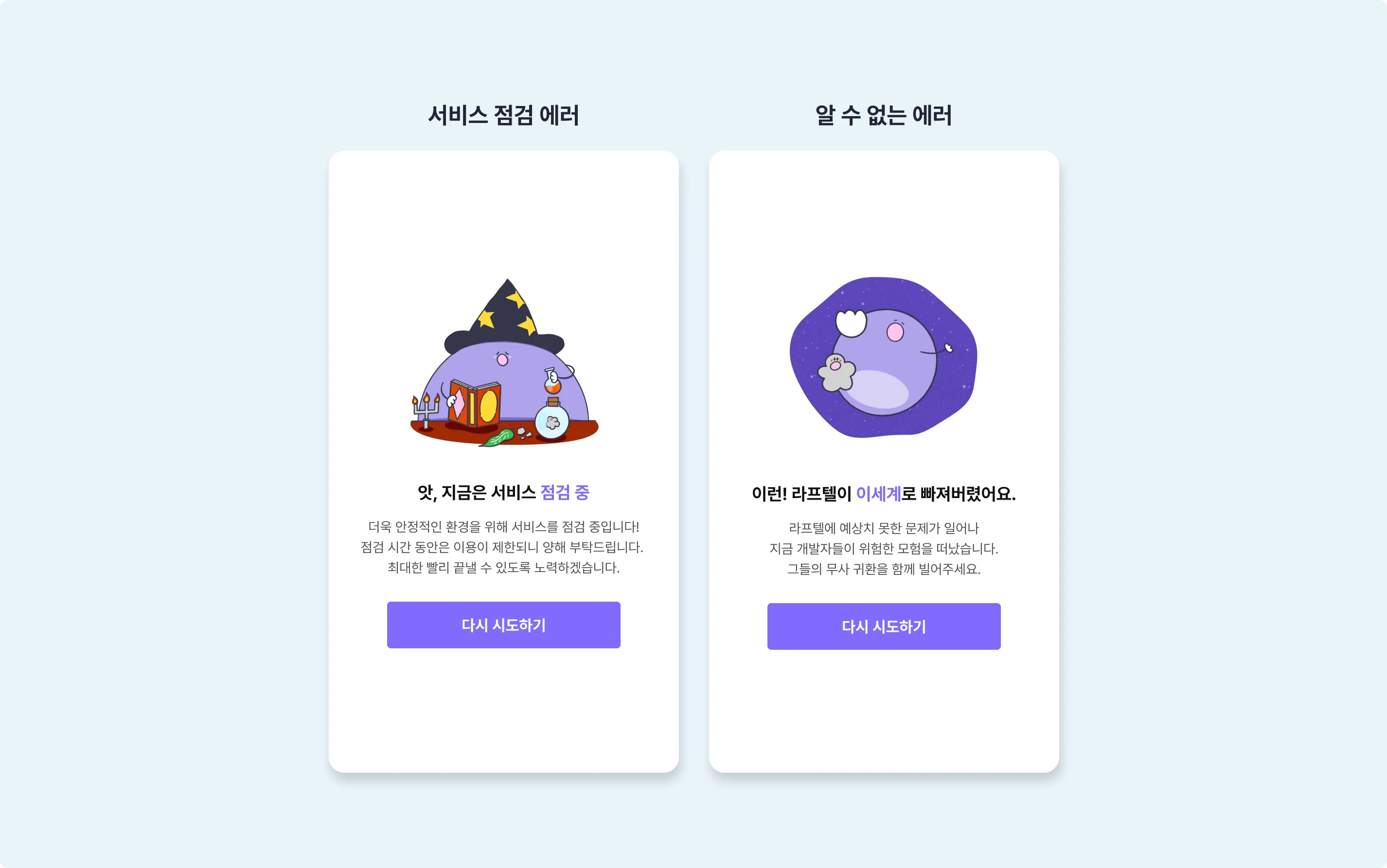 예시 일시적인 오류로 서비스를 이용할 수 없습니다. → 이런! 라프텔이 이세계로 빠져버렸어요.