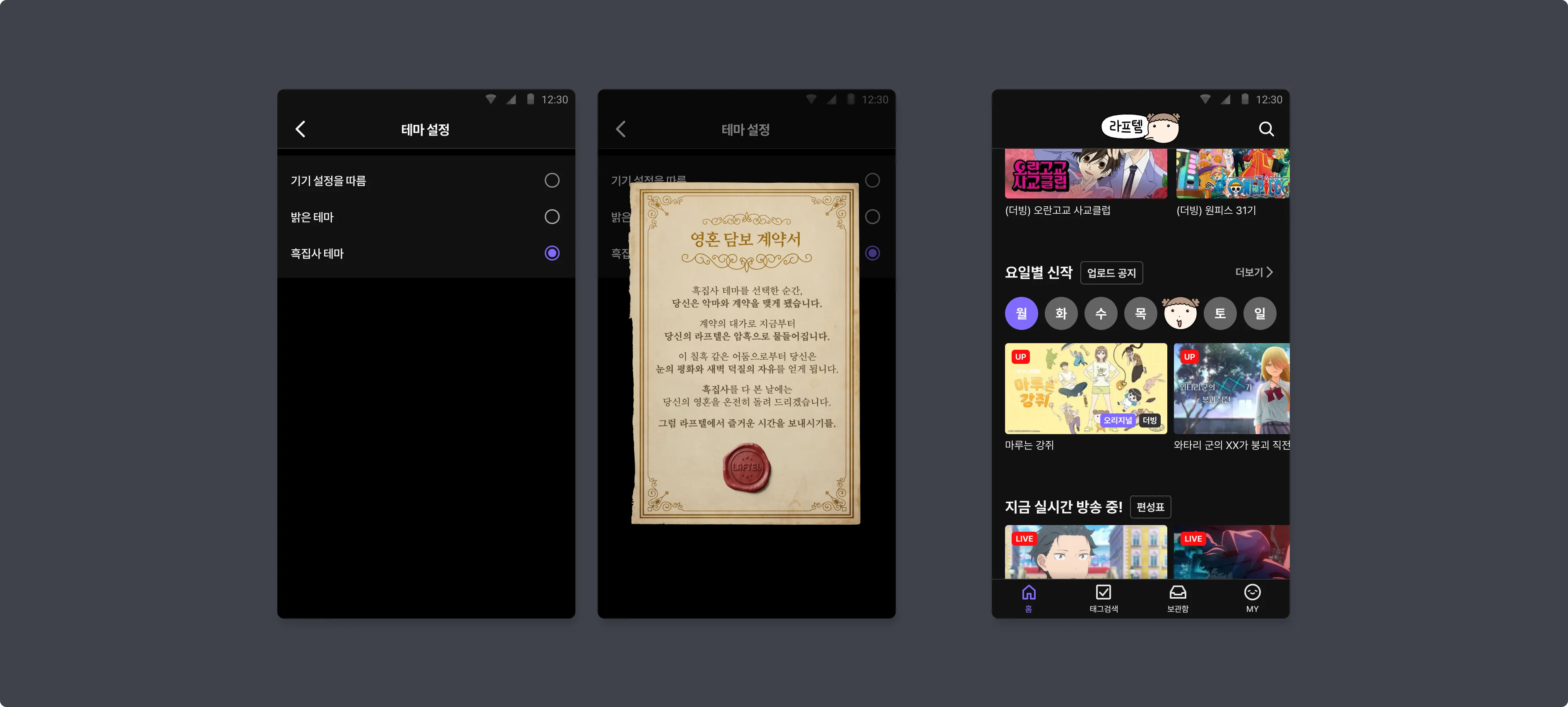 다크모드를 개발했을 때엔 애니메이션 <흑집사> 공개와 함께 ‘흑집사 테마’라는 이름으로 다크모드를 출시하기도 했구요. (글 보러가기) 최근엔 라프텔에서 제작한 애니메이션 <마루는 강쥐> 오픈을 맞아 해당 요일 버튼은 마루 얼굴로 바꾸기도 했었죠.