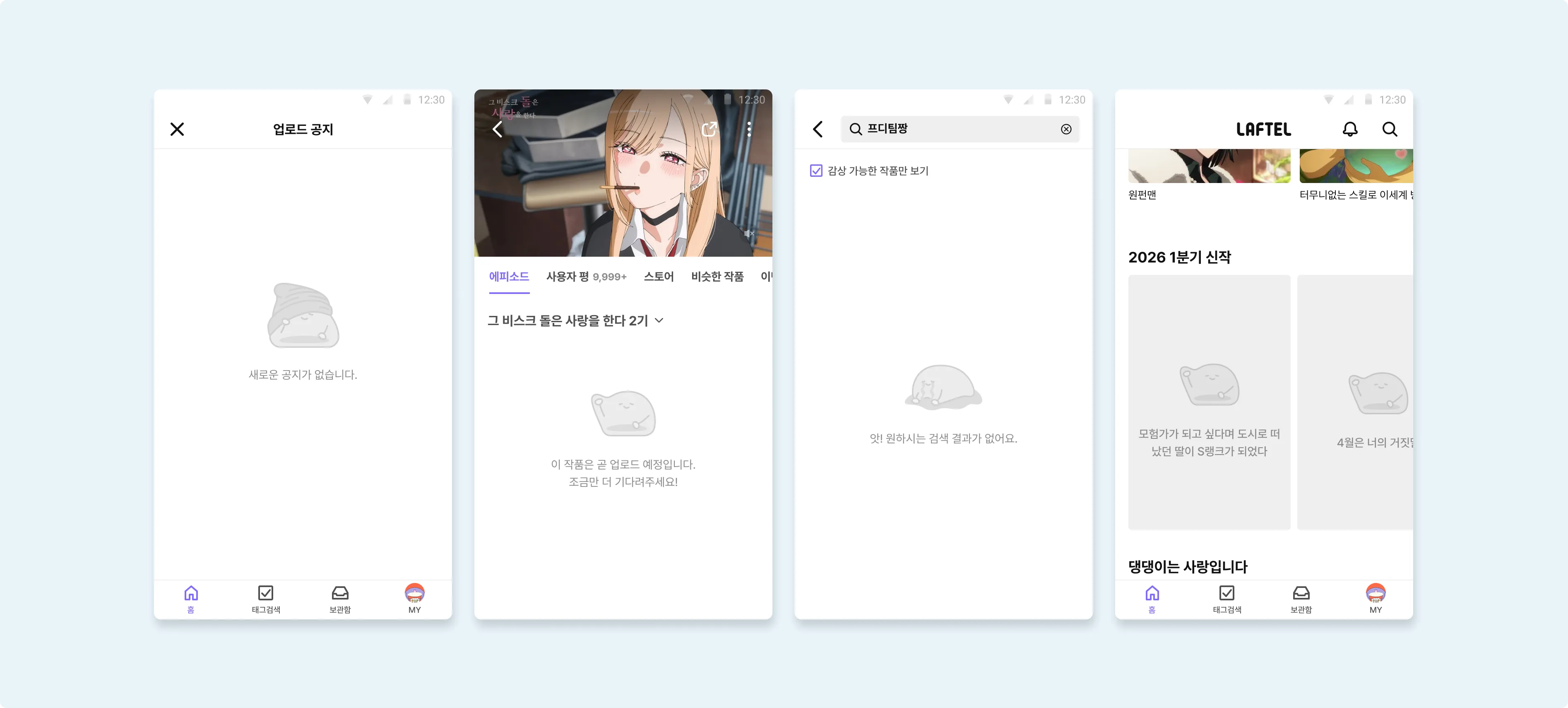 UI를 그리다보면 꼭 마주하는 Empty 케이스 입니다. 라프텔엔 대표 캐릭터 푸밍이가 있어서 이 친구를 적극 활용하곤 하는데요. 일반 안내 그래픽에서는 컬러 푸밍이, Empty에서는 그레이 푸밍이를 사용합니다.