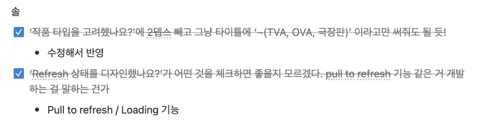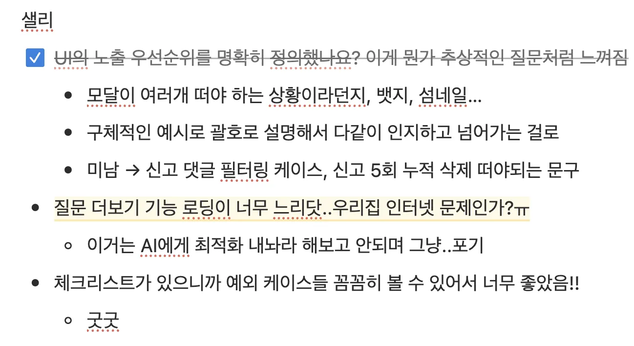 각자 현재 맡은 업무에 체크리스트를 적용해보고 시간이 지난 후 함께 모여 회고 및 피드백 시간을 가졌습니다. 추상적으로 느껴지는 질문은 구체적인 예시를 추가해 명확하게 수정했고, 너무 당연해 보이는 항목도 다시 검토하며 체크리스트를 더욱 다듬었습니다. 기능적인 측면에서 위젯이 다소 느리게 동작하다는 점이 아쉬웠지만 이는 일단 안고 가기로 했습니다.