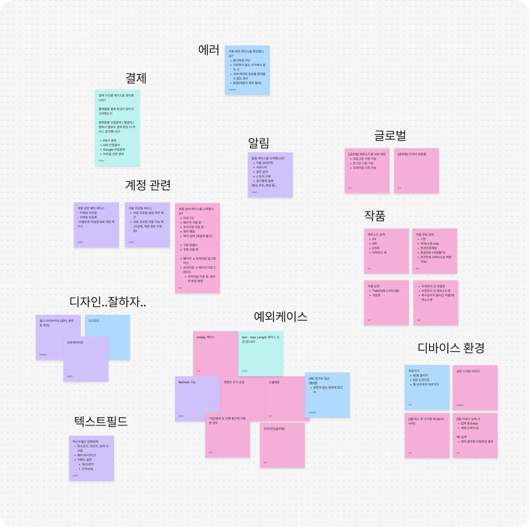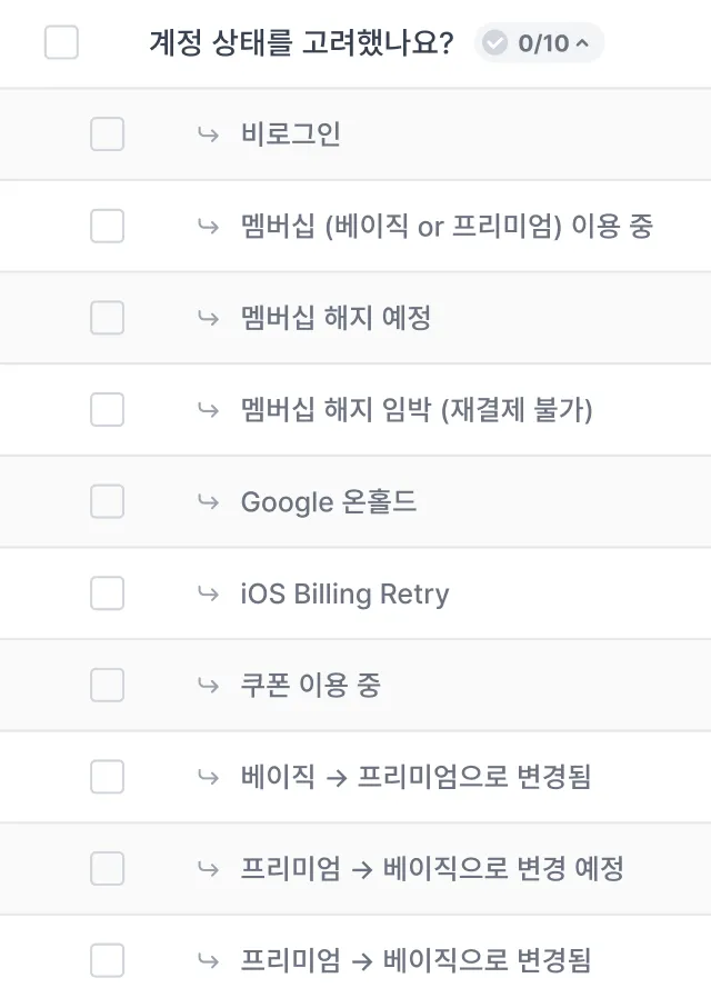 이런 식으로 케이스가 늘어나면서 스토리보드를 아무리 꼼꼼하게 작성해도 사람의 생각만으로는 한계가 있기 마련입니다. 그래서 이런 상황이 반복되는 것을 막기 위해 디자인 체크리스트를 만들어 보자! 라고 생각하게 되었습니다.