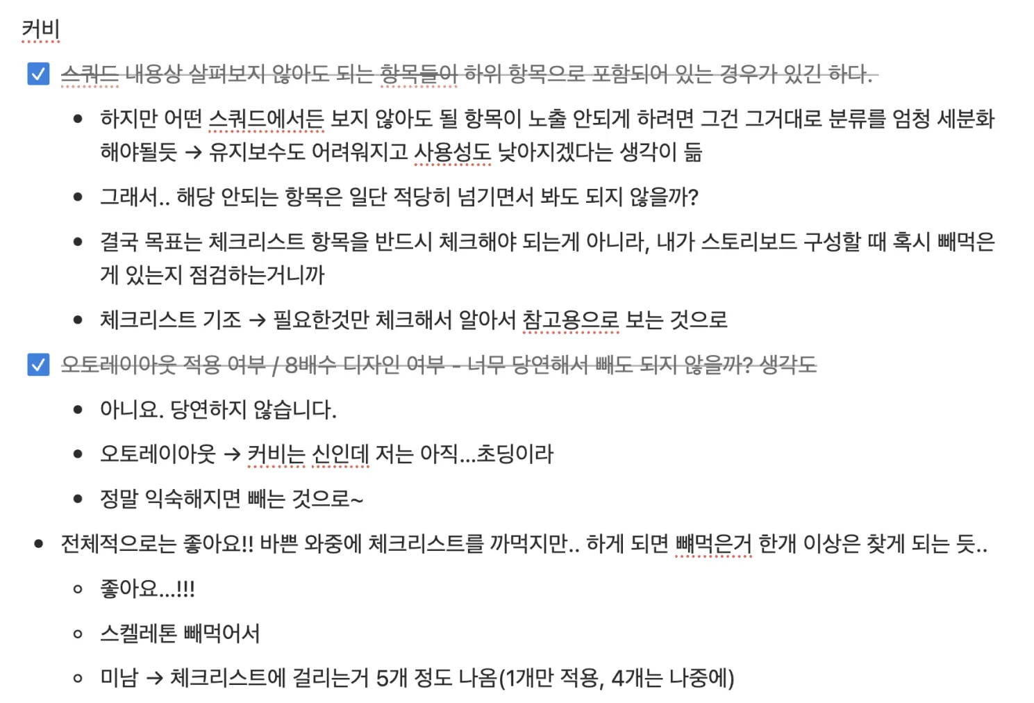 피드백을 통해 최종 완성된 체크리스트를 이제는 실무에서 적극 활용하고 있는데요, 이전에는 하나씩 떠올리며 살펴 봐야 했던 케이스들을 이제는 체크리스트 덕분에 쉽게 확인할 수 있게 되었습니다.