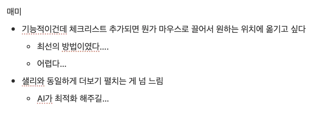 추가로 AI를 활용해 개발에 도전해본 후기도 빼놓을 수 없는데요, 그 동안은 프로덕트 디자이너로서 필요한 툴이 있으면 수동적으로 지원을 기다리거나 개발 팀에 요청하는 방법밖에 없었습니다. 체크리스트 역시 원래라면 아쉬운 대로 우리에게 완전히 맞지 않았던 위젯 중 하나를 썼어야 했을 것입니다.