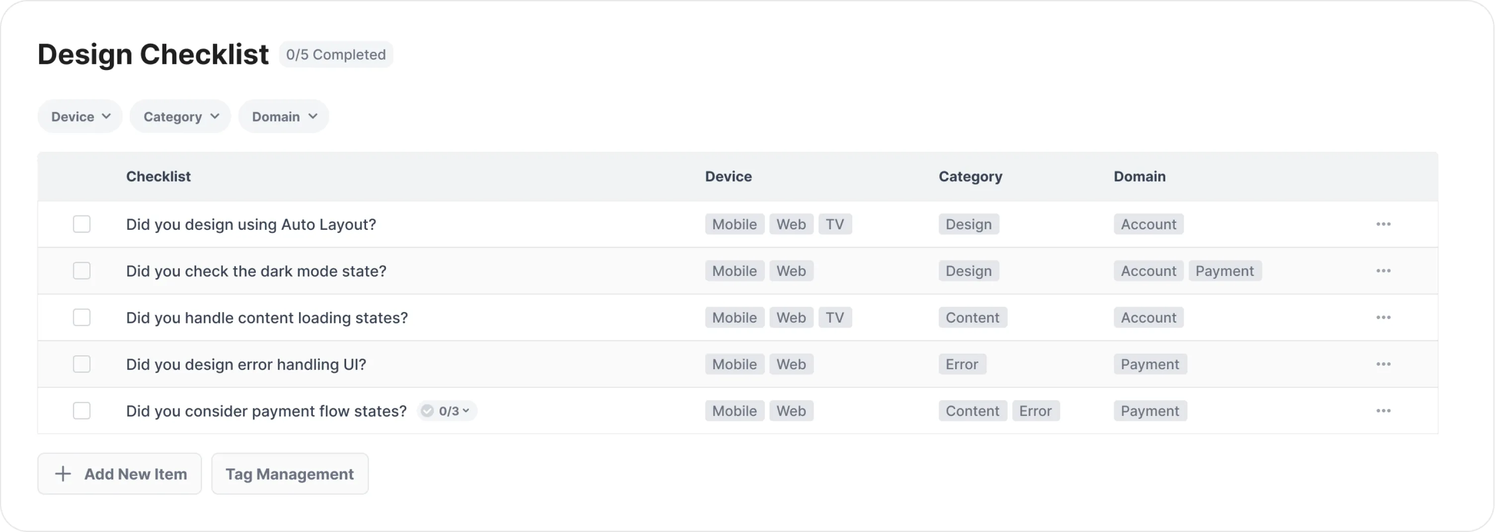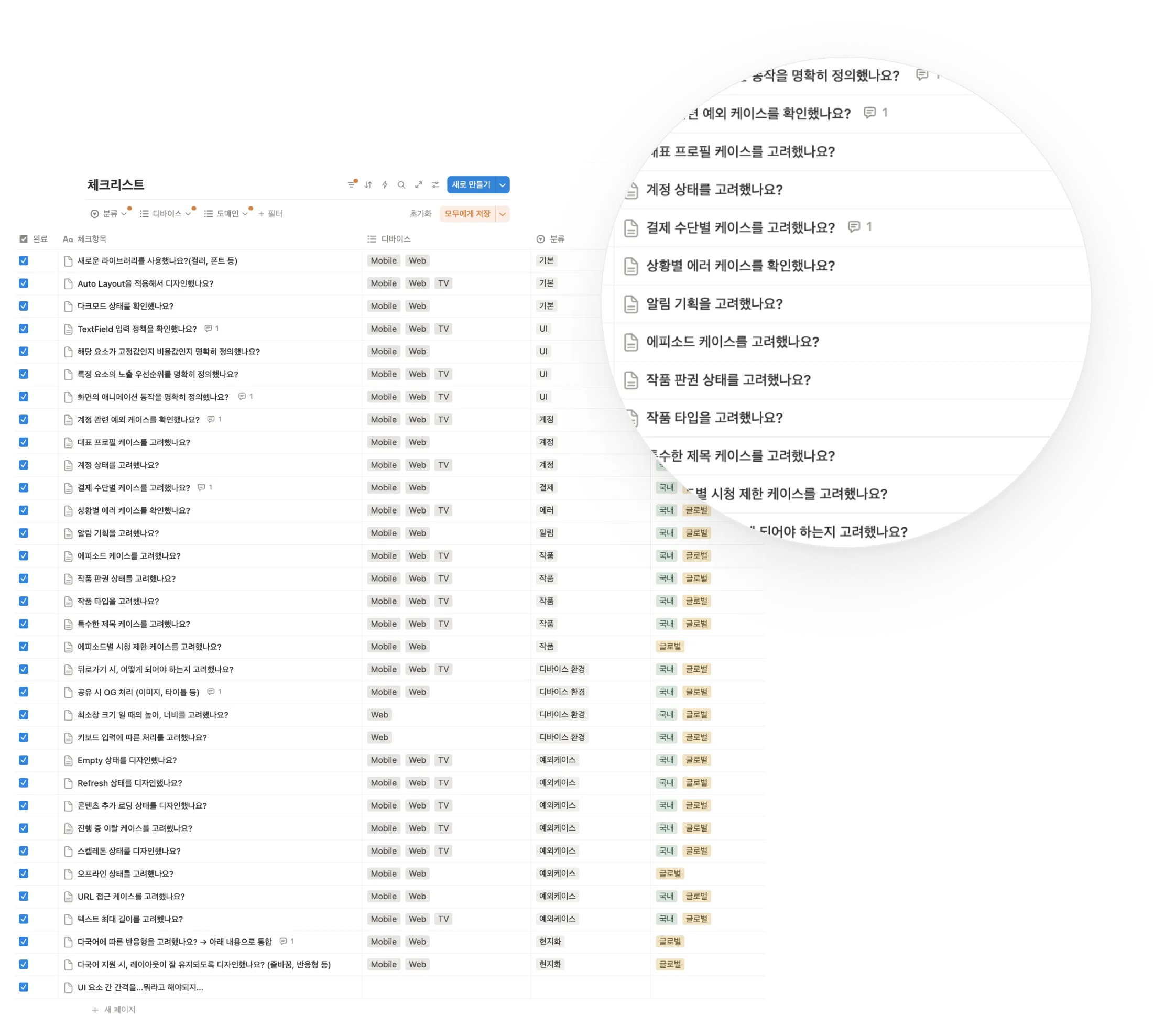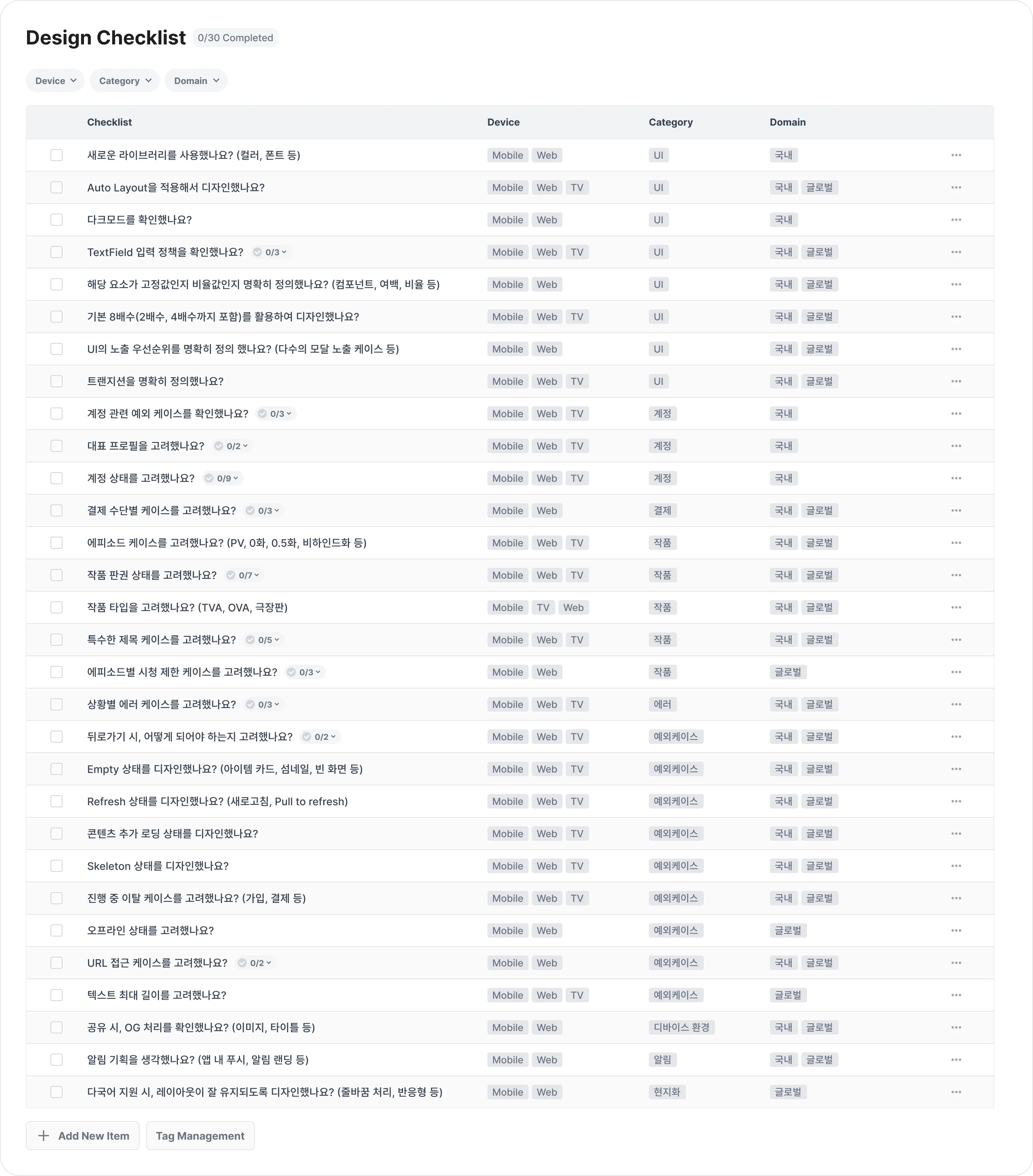다음으로 실제 체크리스트를 제작했습니다. 노션의 테이블 기능을 활용해 리스트를 만들고 각 항목의 세부 내용은 페이지 내부에 추가 체크 항목으로 정리했습니다. 디바이스, 카테고리, 도메인별로도 필터링할 수 있게 설정했습니다.